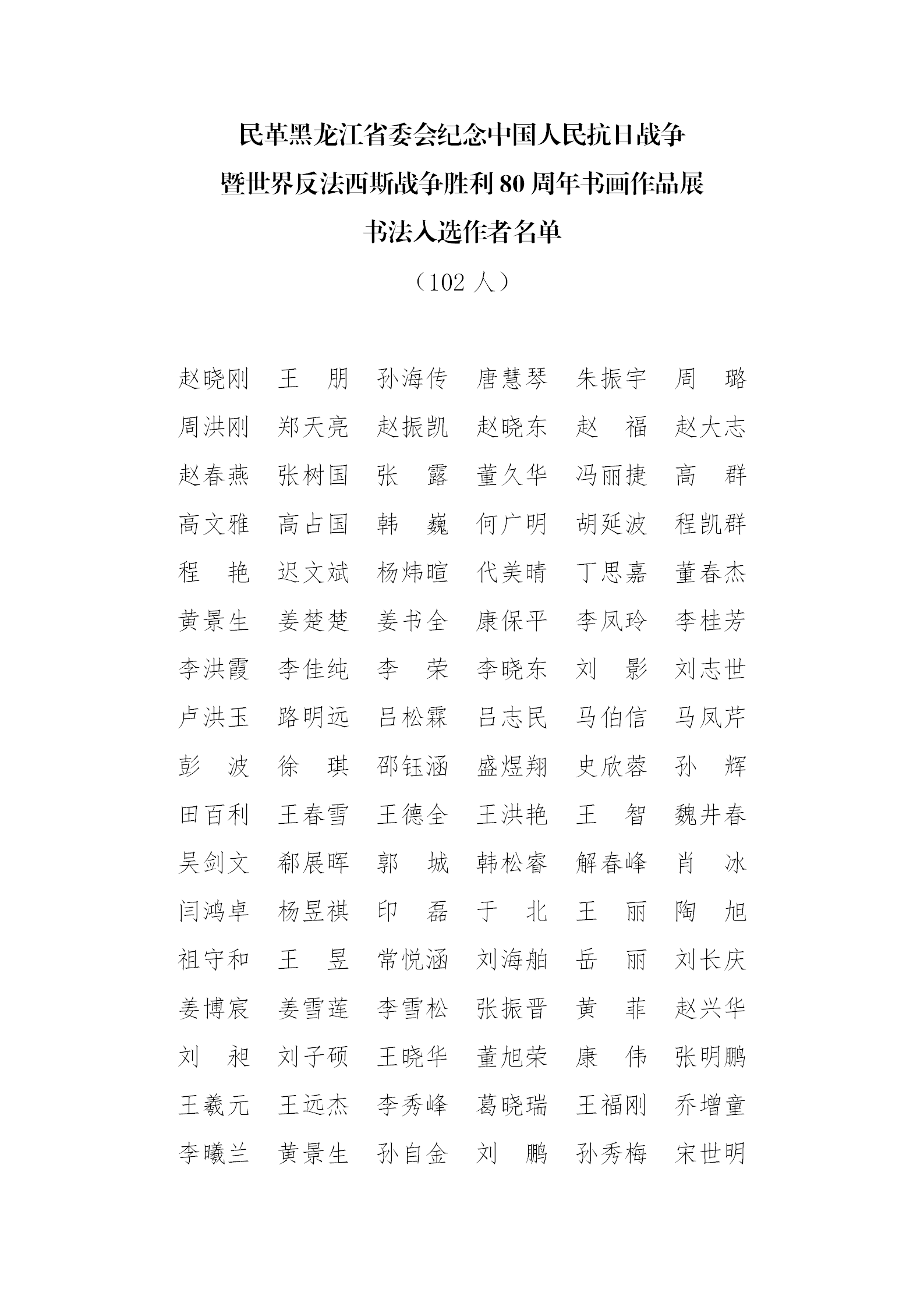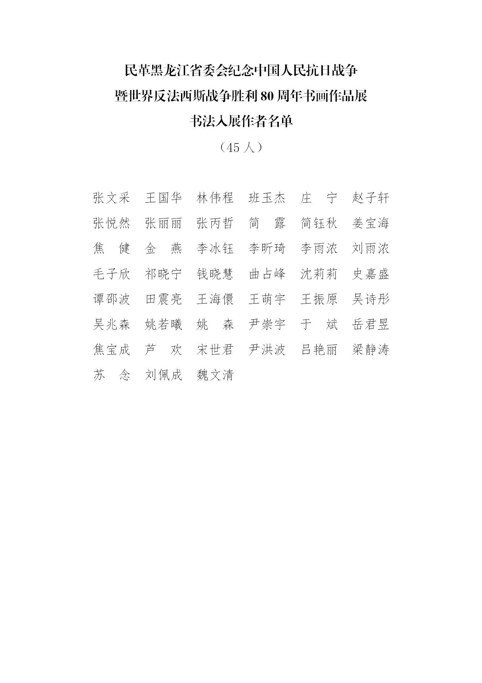 现将“民革黑龙江省委会纪念中国人民抗日战争暨世界反法西斯战争胜利80周年书画作品展”书法入展、入选作者名单公示如下,公示期为2025年8月6日—2025年8月12日(5个工作日)。如对公示名单有异议,可在公示期内反映,反映情况和问题必须实事求是,应签署或告知真实姓名、工作单位和联系方式。对线索不清的匿名信和匿名电话,公示期间不予受理。逾期反映情况不予受理。