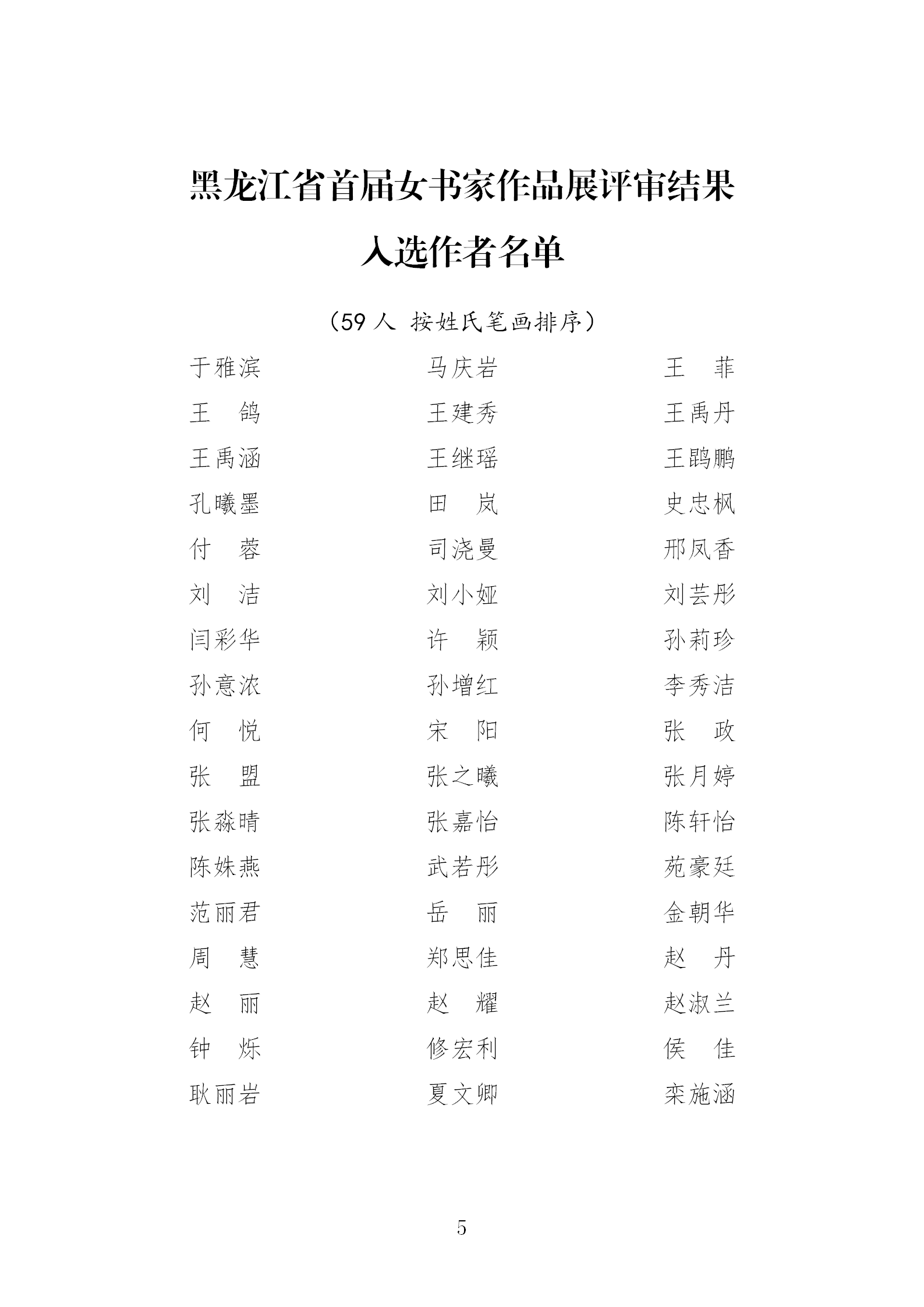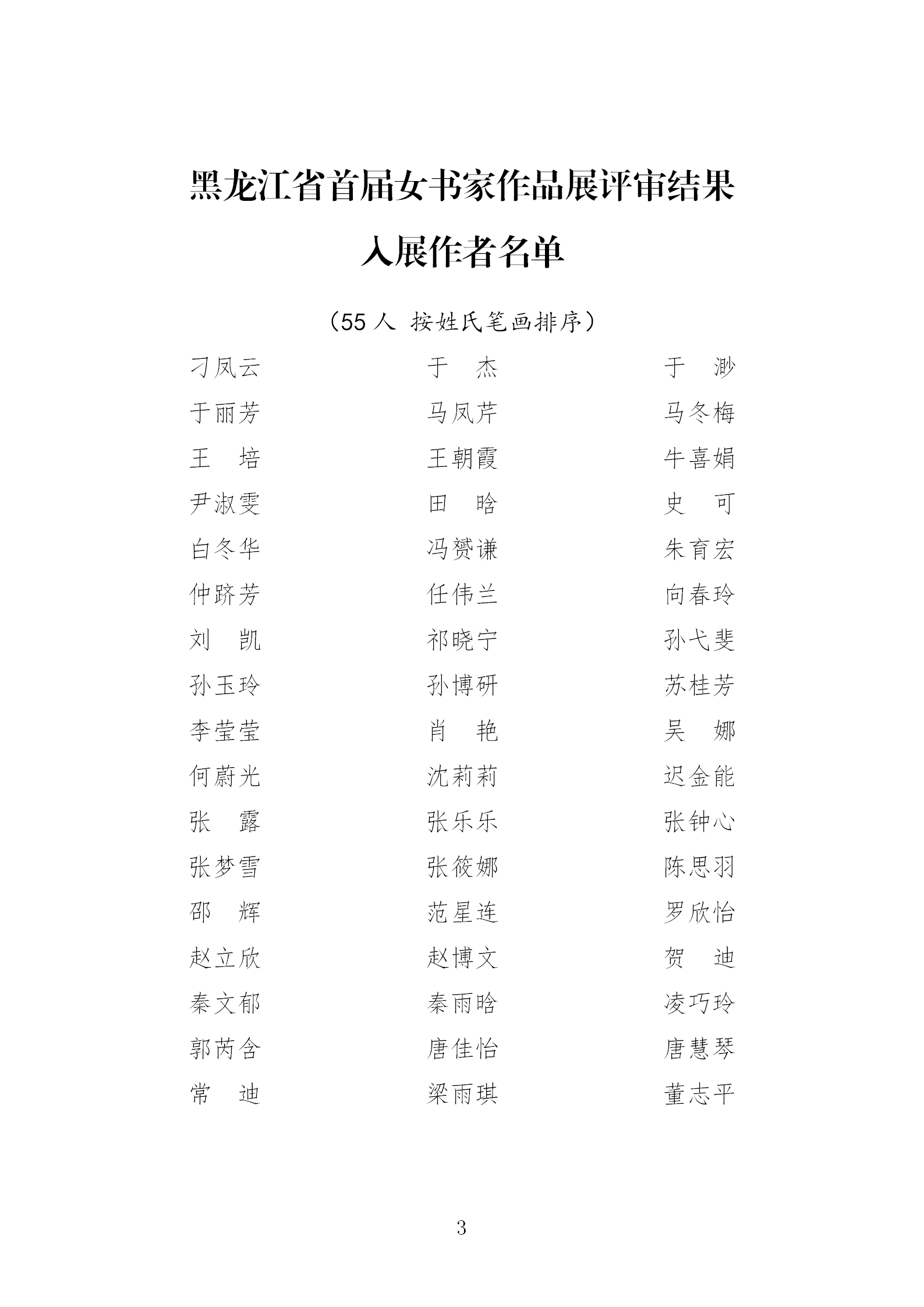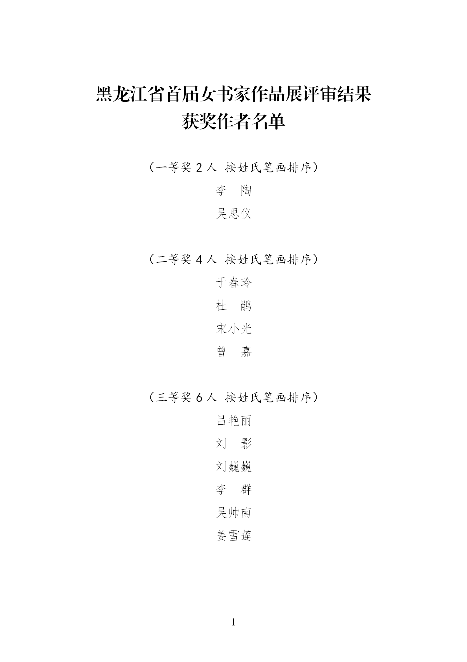按照《黑龙江省首届女书家作品展》征稿启事和评审规定,经评审委员会评审、视频抽查考核,获奖、入展、入选作者名单现予公布。