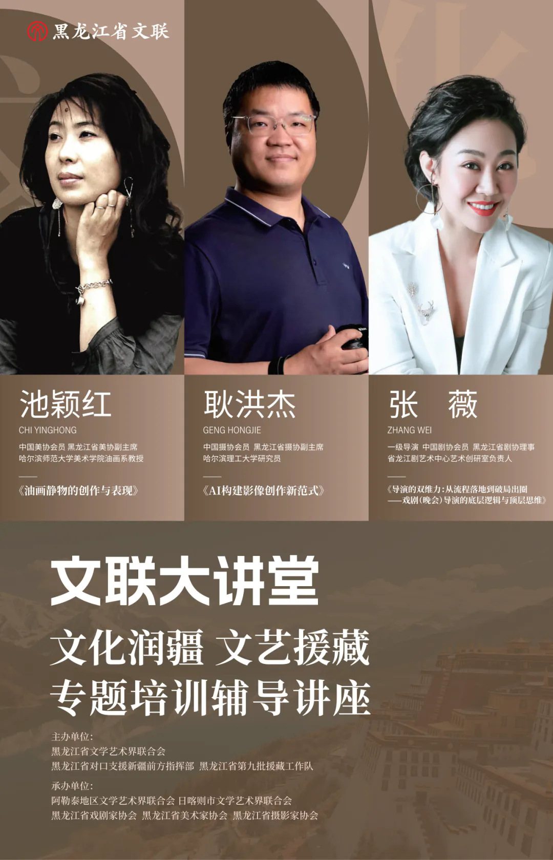 为深入学习贯彻党的二十届三中全会精神,全面贯彻落实中央民族工作会议精神,由黑龙江省文学艺术界联合会、黑龙江省对口支援新疆前方指挥部、黑龙江省第九批援藏工作队等主办,阿勒泰地区文联、日喀则市文联、黑龙江省戏剧家协会、黑龙江省美术家协会、黑龙江省摄影家协会等承办的黑龙江省文联“文化润疆 文艺援藏”专题培训辅导讲座将于9月29日、30日举办。