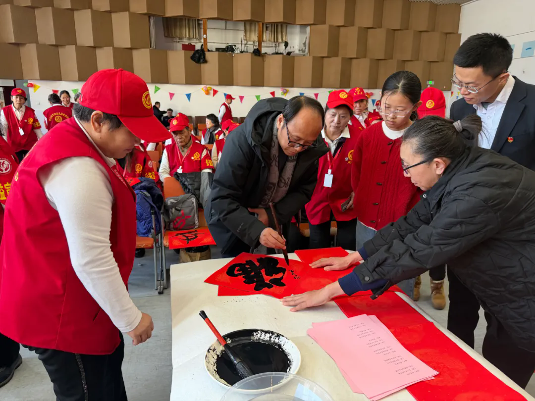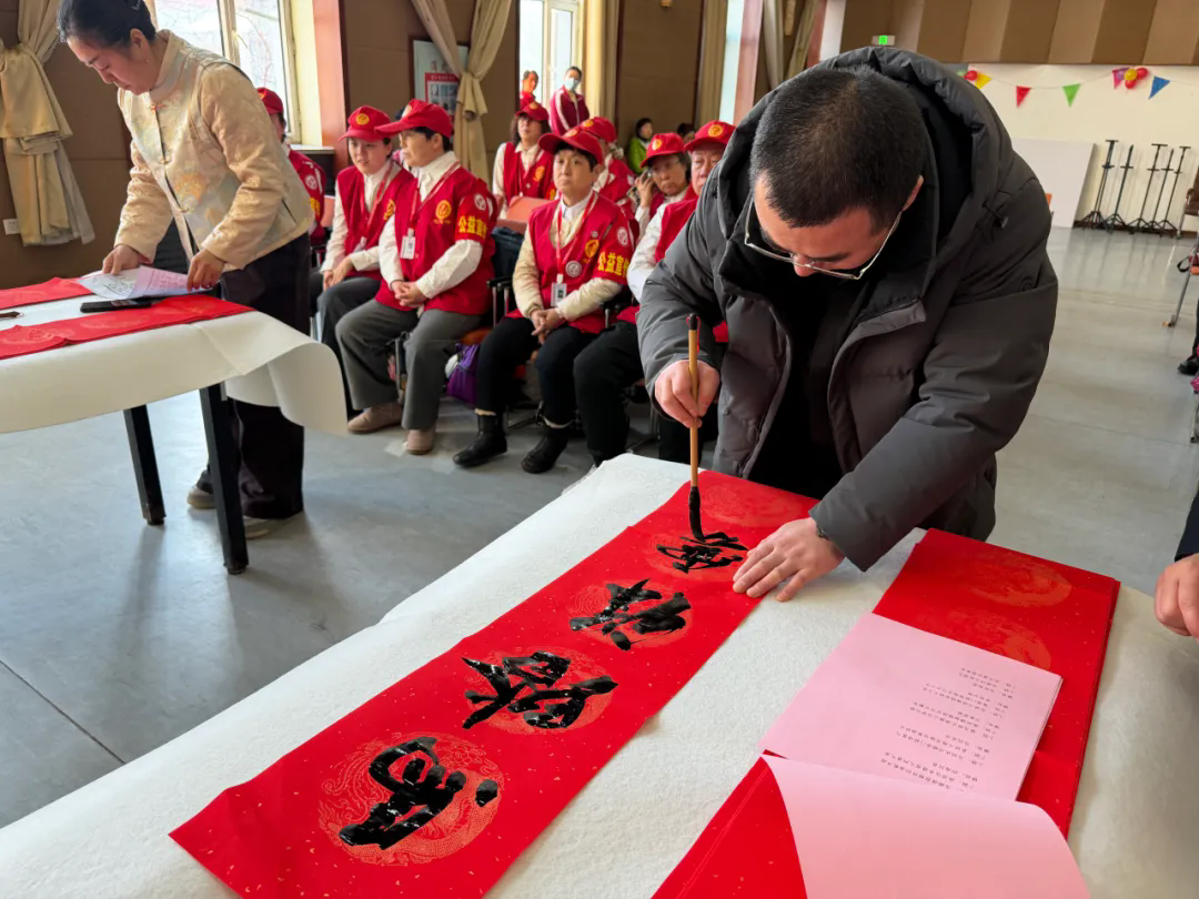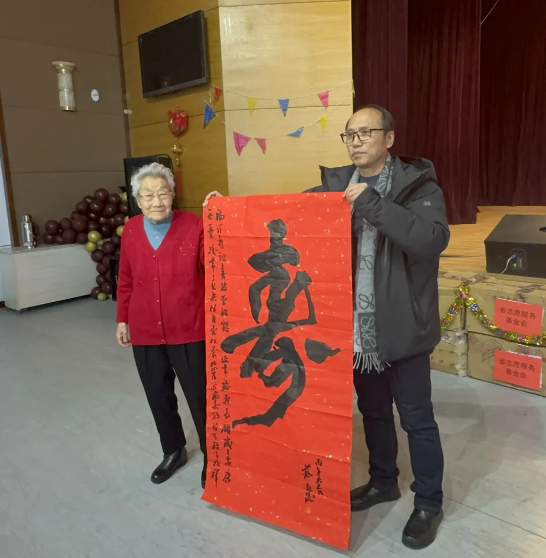 在热烈的氛围中,主办单位有关负责同志向联盟志愿服务队代表授旗,并向福利院的老年朋友们捐赠春节慰问物资,用实际行动传递关怀。活动期间,省书法家协会志愿者现场挥毫泼墨,书写春联“福”字,将浓浓的年味与祝福融入笔墨之间,省书法家协会主席蔡兴洲,省美术家协会驻会副主席、秘书长石正军,将书写的“寿”字书法作品赠送给百岁老人王荷初,并祝愿老人幸福安康。来自北大荒知青志愿者协会的文艺志愿者带来了精彩的文艺演出,哈尔滨市安康福利院的老年朋友也融入到热烈的氛围中去,即兴表演了京剧等节目,歌舞交融间让老年朋友们感受到满满的节日氛围。活动结束后,老人们有序领取春联“福”字,脸上洋溢着幸福的笑容。