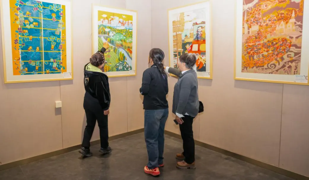 为深入学习贯彻习近平文化思想,全面贯彻新时代党的民族理论和民族政策,以文艺作品扩大各民族文化交流交往交融,按照省文联文化润疆的工作安排,本次展览还邀请了新疆阿勒泰地区农民画群体创作的20件作品。这些作品大多取自本地的自然景观、民俗风情、生产生活场景,如大漠绿洲、民族歌舞、巴扎集市、狩猎放牧等,也有民间寓言故事以及时代新风等内容,充满浓郁的乡土气息。