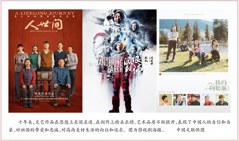 这是主旋律文艺作品在思想上求深求进、在制作上精益求精、艺术品质不断提升、表现亮眼的十年。电视剧《觉醒年代》召唤追求真理、燃烧理想的澎湃岁月,《山海情》表现山海相连、守望相助的社会主义制度优越性,《人世间》对工人阶级精神风貌进行了史诗性的开掘,《大江大河》再现改革开放的壮阔历史,《我的阿勒泰》呈现了绿草如茵、山河斑斓、人间有情、民族相亲的北疆大地……在一部部文艺作品中,人们从生命的深处领会到把我们紧紧团结和凝聚在一起的信念:作为中国人的自信和自豪,对祖国的挚爱和忠诚,对高尚美好生活的向往和追求,这是我们共同的家园,是我们共同奔赴的远方。乐舞、吟咏和歌唱,辞章和故事、图像和影像,新时代的中国人从多姿多彩的文艺作品中分享共同的情感、共同的价值观。培根铸魂、启智润心,弘扬中华文明以诗教人、以文化人的传统,培育和倡导全体中国人民共同的价值追求和精神认同。这正是新时代文艺根本的社会责任之所在。