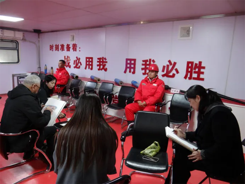 10月18日上午,采风团来到修井107队,美术家们深入井队,与工人们交流,了解他们的工作流程和生活状态,用画笔记录下石油工人在现代化工业生产中的奋斗身影,展现新时代油田工人的风采。