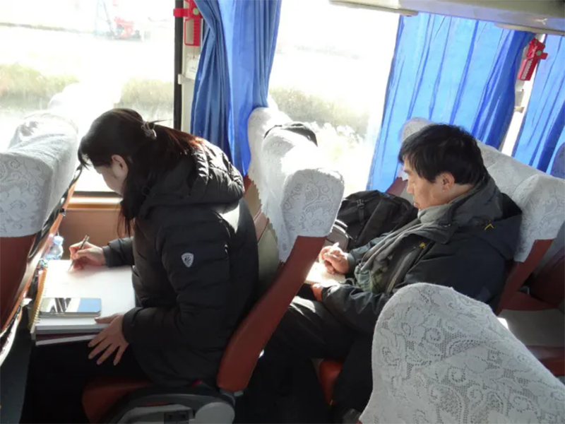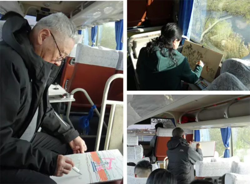 当日下午,采风团来到陈家大院泡湿地。这里是大庆油田最大丛式井组群所在地,有着工业与自然融合的独特景观。当日寒风凛冽,气温零下,室外无法作画,大家克服一切困难,在大巴车上完成了写生。