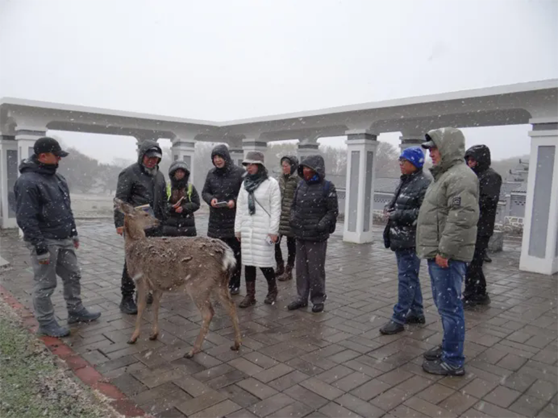 10月19日,采风团来到哈尔滨,在森工平山园采风写生,这里融合了金源文化、森林文化和鹿文化等多种文化元素。美术家们在科普馆、森林湿地、月亮湖等自然景观,与梅花鹿、马鹿、白鹿、牦牛等动物和谐共处,当天恰逢初雪,采风团在文化与自然深度融合的情境中冒雪写生,并搜集了丰富的创作素材。