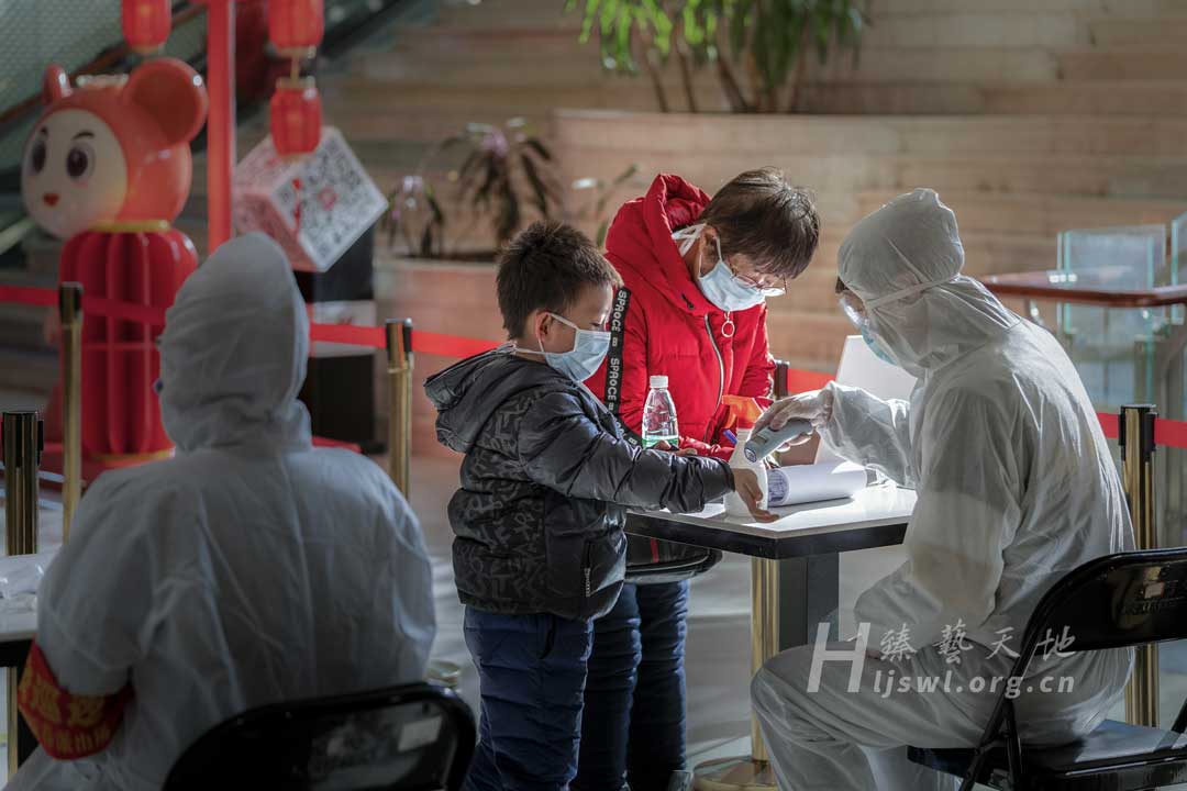 2020年3月11日,哈尔滨市,市民正在为进入商场进行扫码测温登记,工作人员坚守岗位。