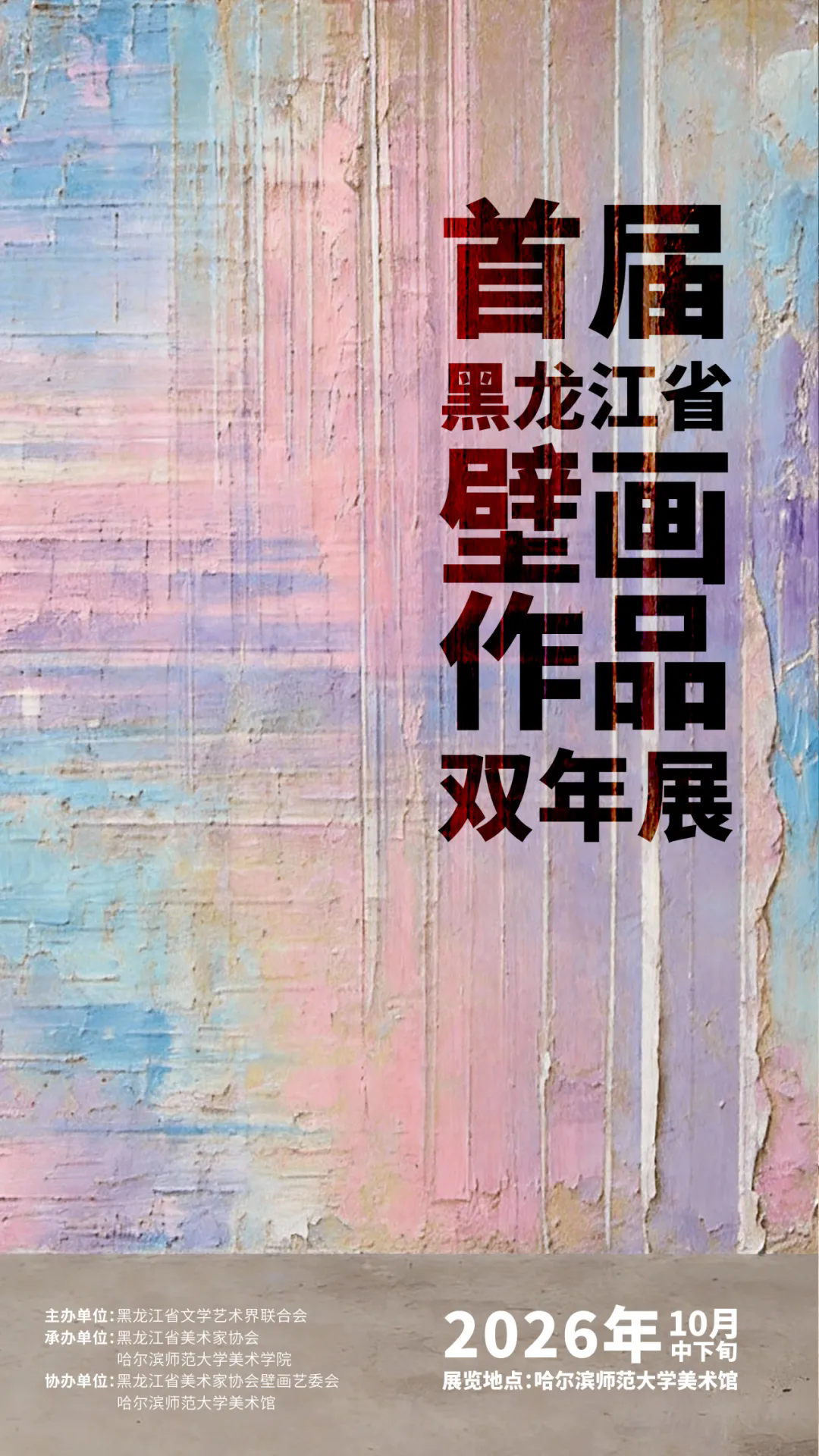 为深入学习贯彻习近平文化思想,全面展示黑龙江省壁画艺术创作与研究成果,黑龙江省美术家协会拟定于2026年10月举办首届黑龙江省壁画作品双年展。本次展览着力探索地铁壁画与乡村壁画两大实践领域,旨在用优秀的壁画作品生动描绘城市发展、乡村建设、山川风貌与人民幸福的新气象新风采,并在创作实践中逐步培育兼具思想性、艺术性和创造性的壁画人才队伍,从而全面促进黑龙江省壁画艺术实现高质量发展。现将本次展览的征稿事宜通知如下: