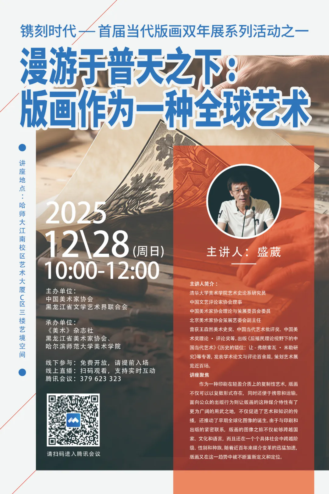 12月28日上午,作为“镌刻时代——首届当代版画双年展”系列活动之一的特邀讲座在哈尔滨师范大学美术学院举行。清华大学美术学院艺术史论系研究员、《美术》杂志副主编盛葳以《漫游于普天之下:版画作为一种全球艺术》为题,为省内版画创作者、高校师生及艺术研究者带来了一场兼具历史纵深与当代关怀的学术报告。