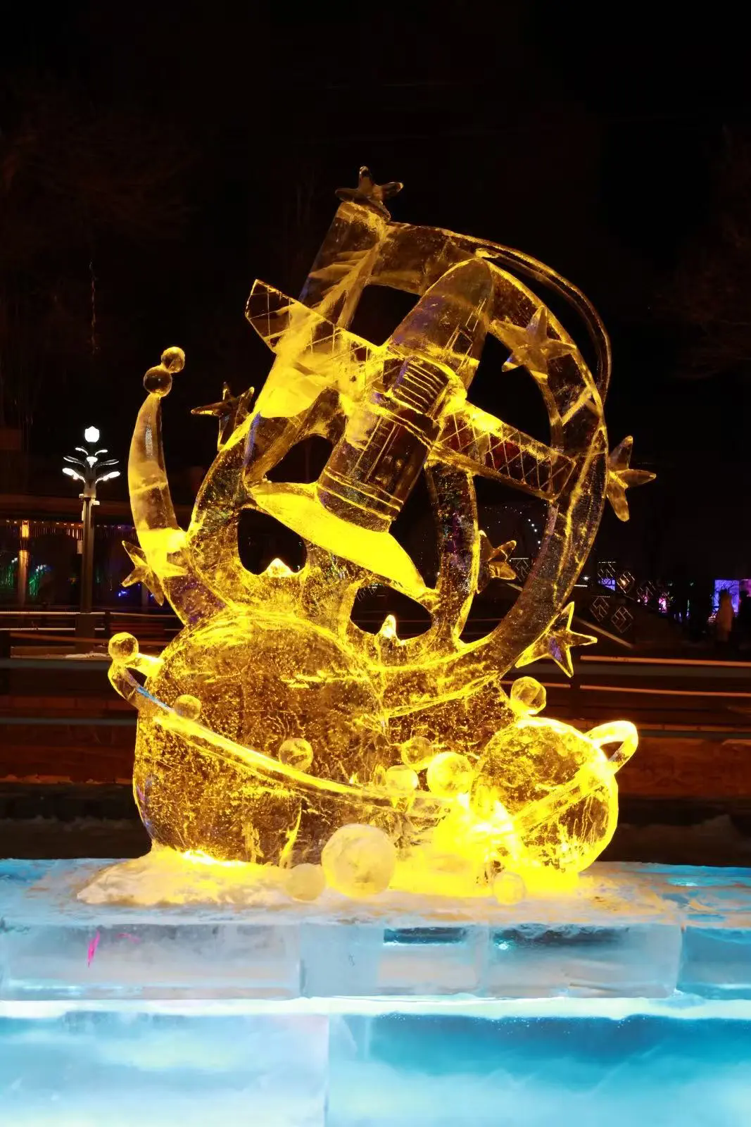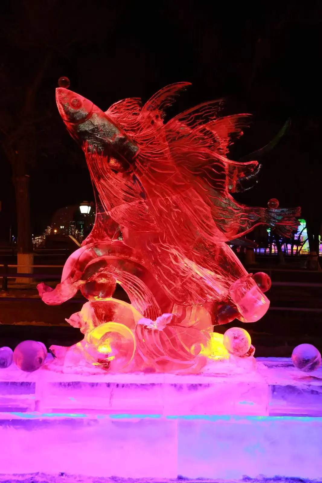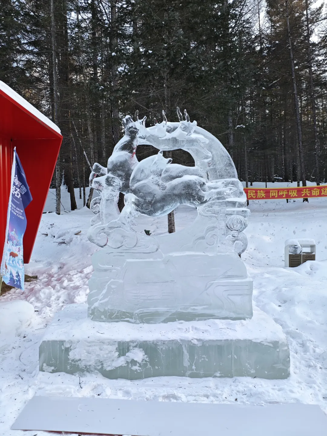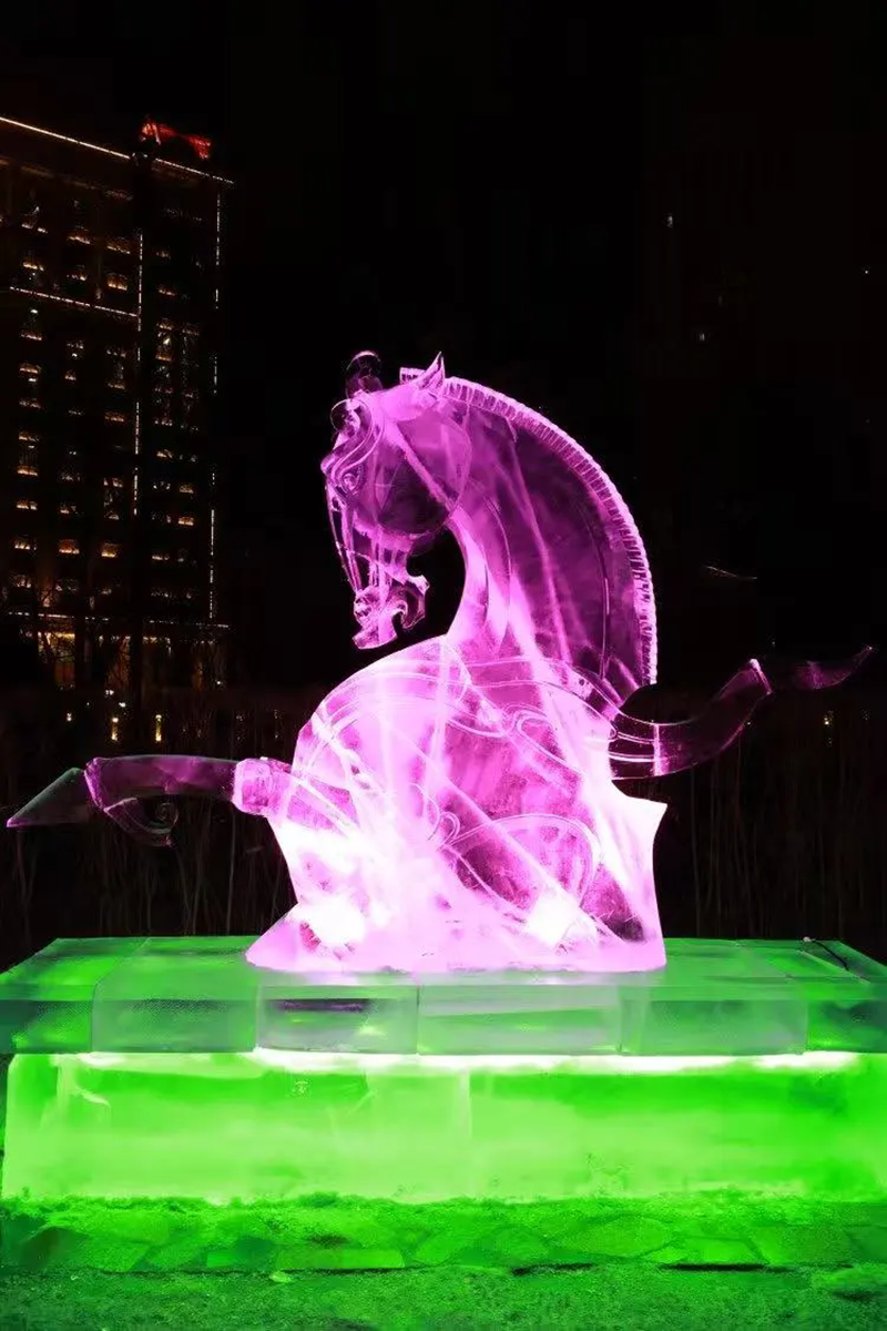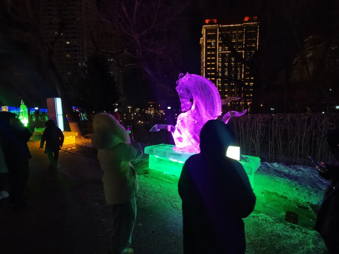 展览作品综合运用浮雕、透雕、圆雕及镂空雕刻等技法,在传承传统冰雕技艺精髓的同时,积极融入当代审美与时代关切,生动展现了冰雕艺术创造性转化与创新性发展的清晰路径。在哈尔滨兆麟公园主展区,作品在白昼自然光下折射出清透光晕,入夜后又依托内置灯光呈现出明暗流转的视觉韵律,仿佛被赋予呼吸,娓娓道来北国独有的冰雪故事。伊春汤旺河林海奇石景区分展区的作品,则与苍茫林海、皓白雪原相映成趣,实现了人工创作与自然景观的和谐共鸣。整体而言,本届展览作品创作既延续了黑龙江冰雕深植地域文化的传统,生动刻画北国冰雪生态与民俗风情,亦积极呼应生态和谐、科技人文等当代思考,实现了艺术形式与精神内涵的双重探索,推动冰雕艺术从工艺传承走向观念表达的新阶段。